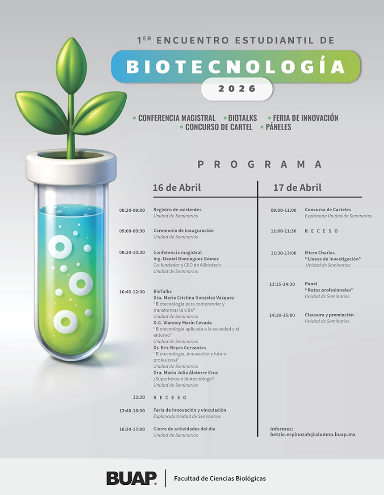 La comunidad estudiantil de la BUAP tiene una cita imperdible con el futuro de la ciencia en el “Primer Encuentro Estudiantil de Biotecnología 2026” el 16 y 17 de abril de este 2026. Este evento de dos días está diseñado para ser un punto de convergencia, intercambio de conocimientos y celebración de la innovación en el campo de la Biotecnología, reuniendo a estudiantes, académicos e investigadores.